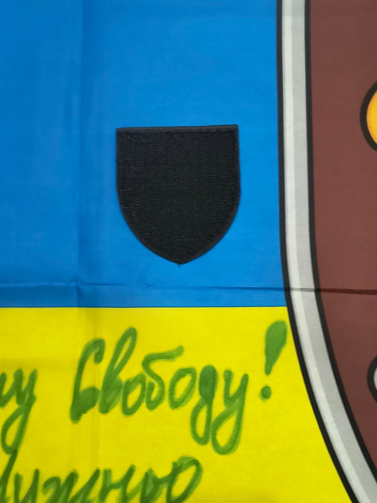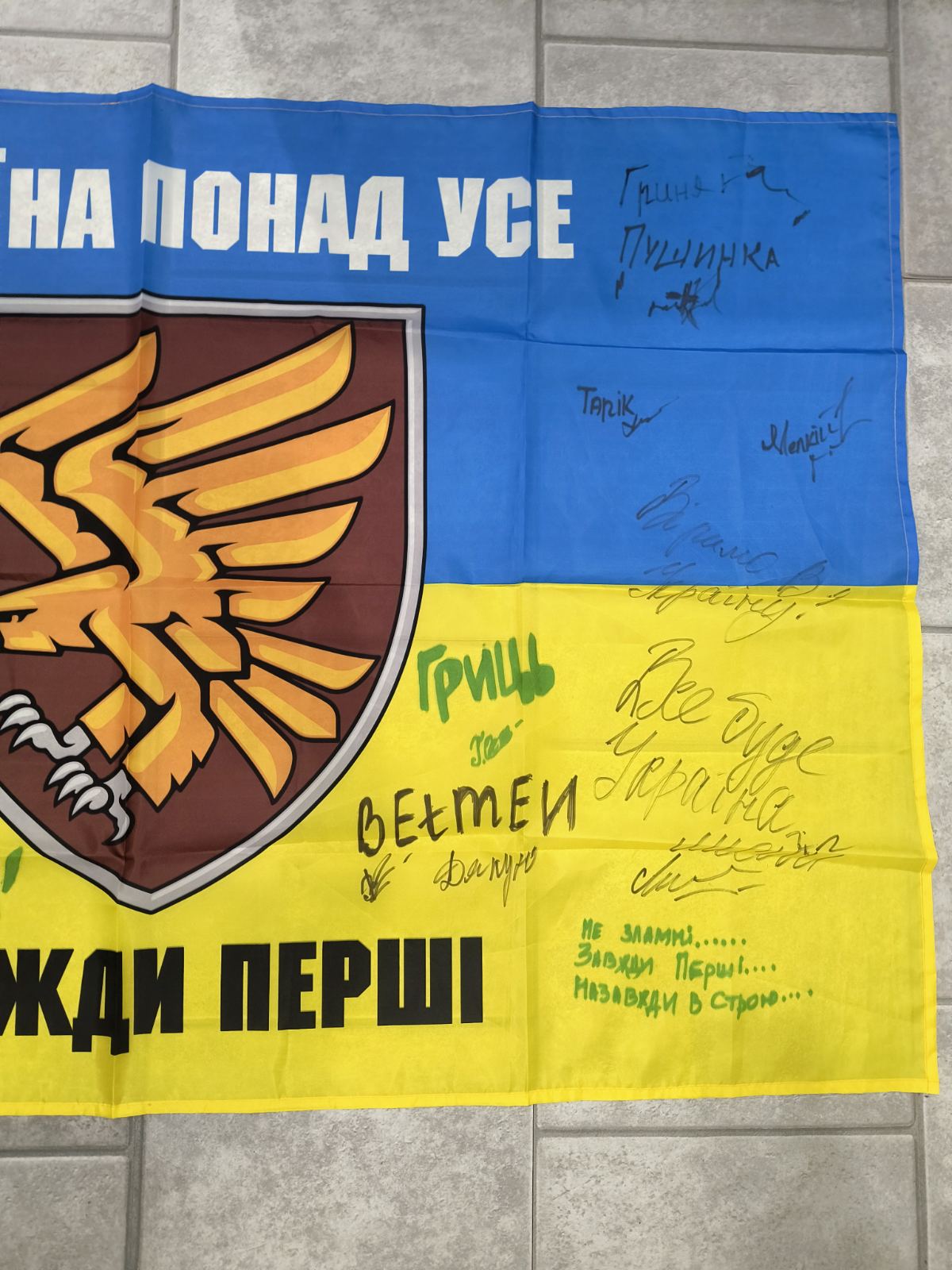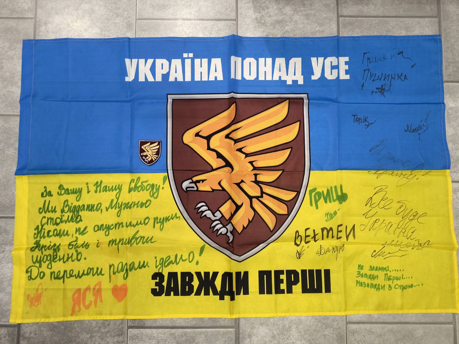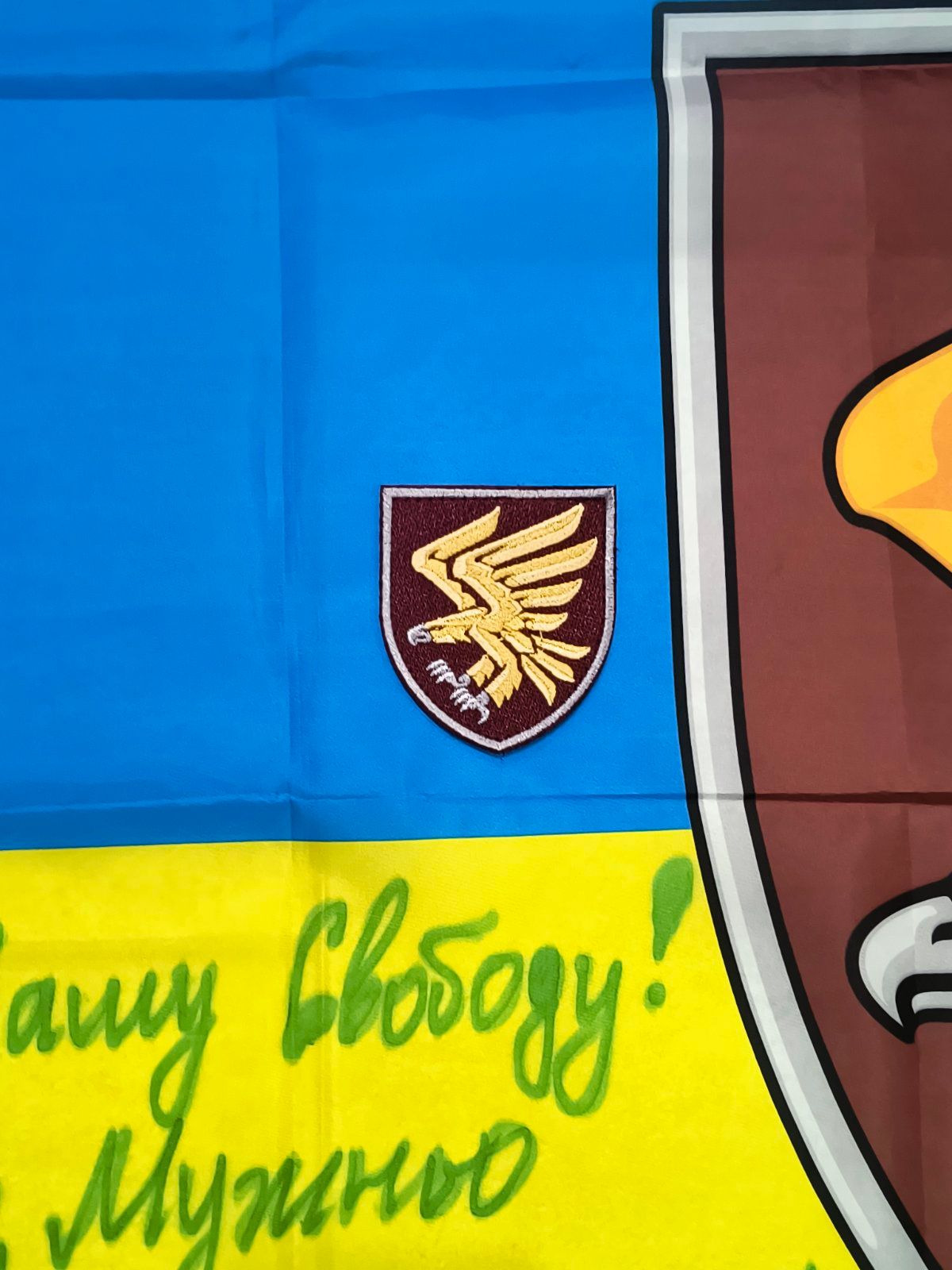 Ukrainian flag signed by fighters of 95th Air Assault Brigade with Patch