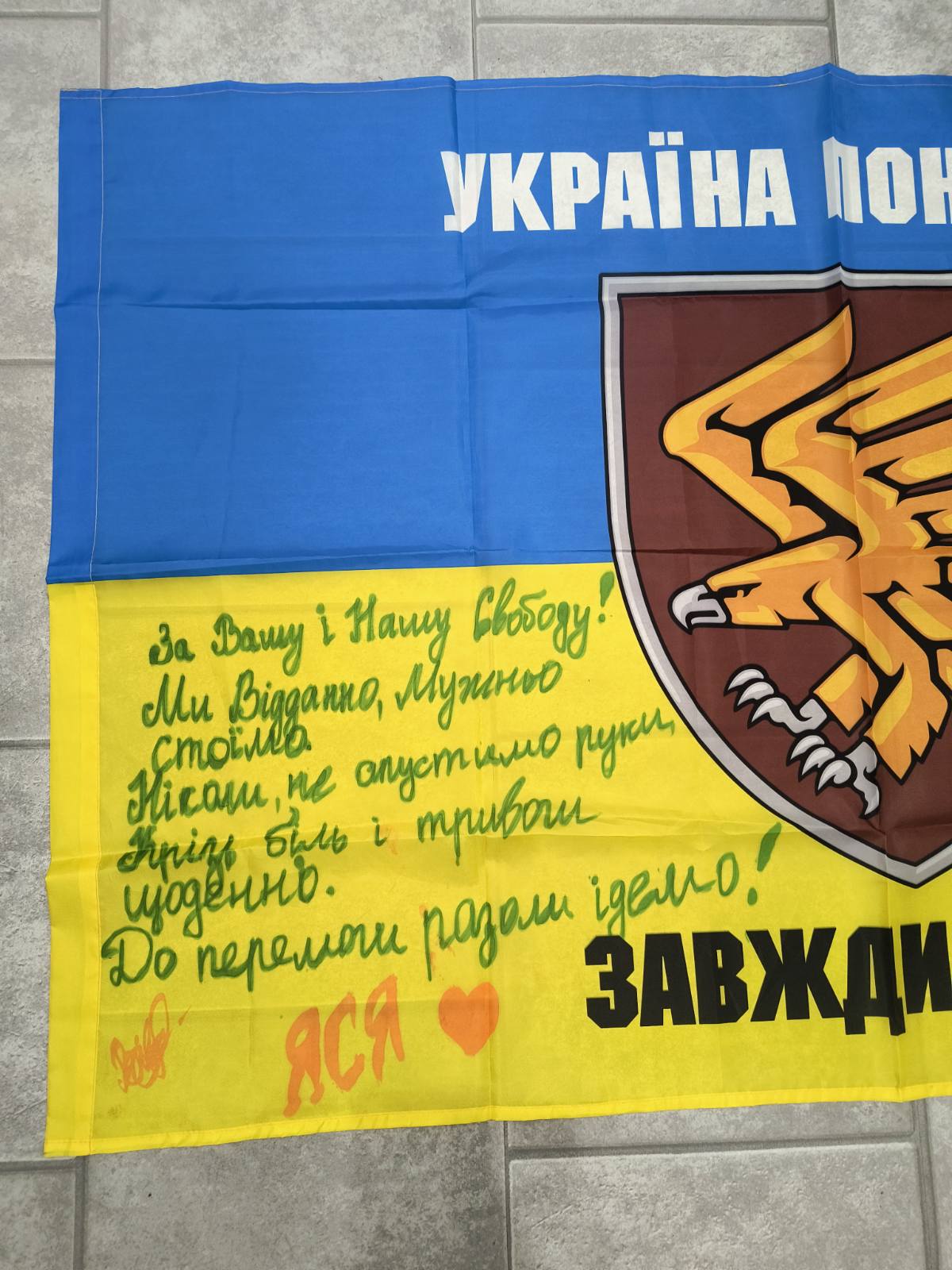 These flags are signed by soldiers of the Ukrainian Armed Forces of different brigades fighting on the front line. The flags are collected by volunteers who bring various aids to these teams. By selling these flags, volunteers raise funds for our heroes who defend our freedom!