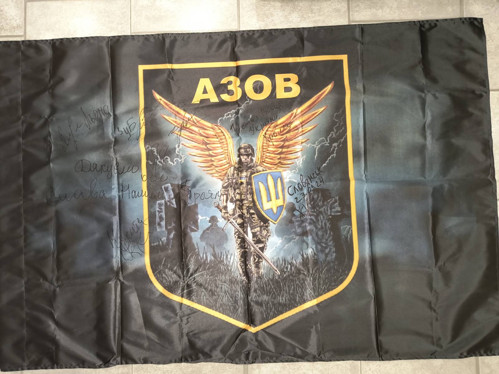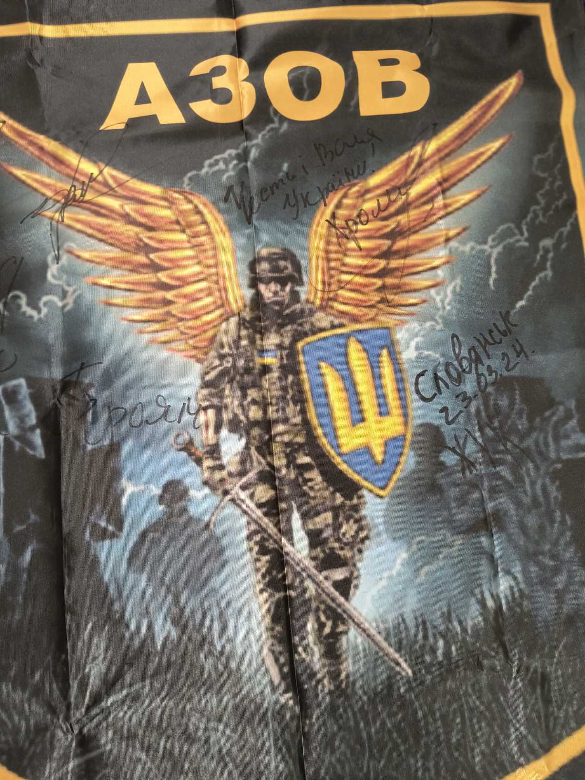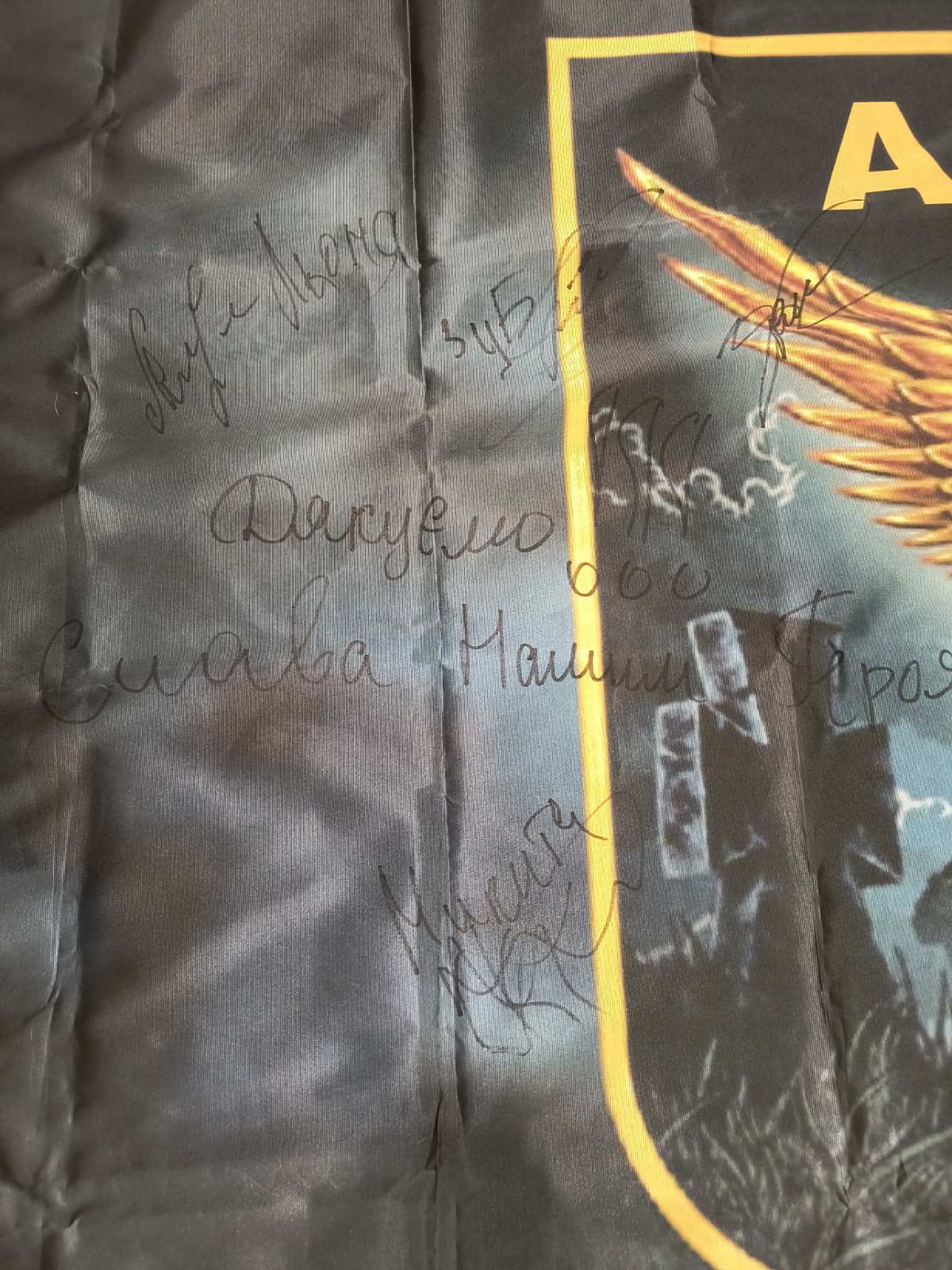 The flag has signatures and the words of gratitude from fighters for those who buy it and supports this brigade.